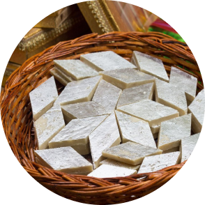Delight in Ghee Cashew Cake, Ladoo, Mysore Pak, and Dry Gulab Jamun.
